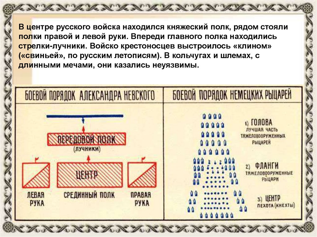 В центре русского войска находился княжеский полк, рядом стоялиполки правой и левой руки. Впереди главного полка находились