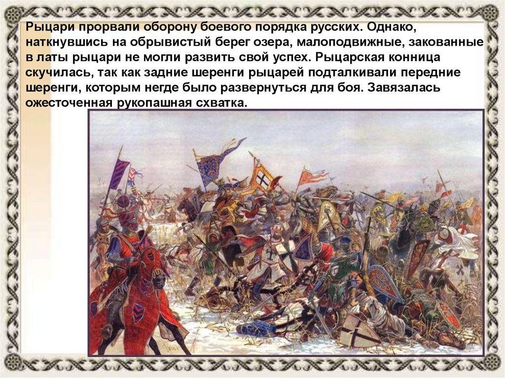 Рыцари прорвали оборону боевого порядка русских. Однако,наткнувшись на обрывистый берег озера, малоподвижные, закованные