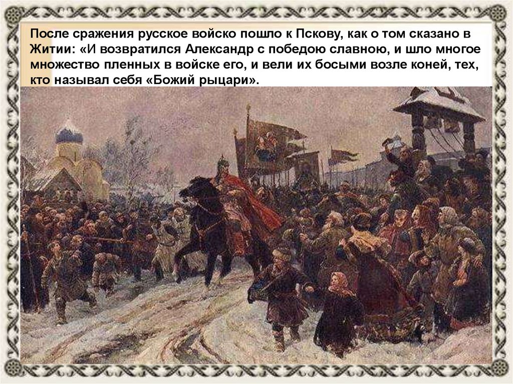 После сражения русское войско пошло к Пскову, как о том сказано вЖитии: «И возвратился Александр с победою славною, и шло многое