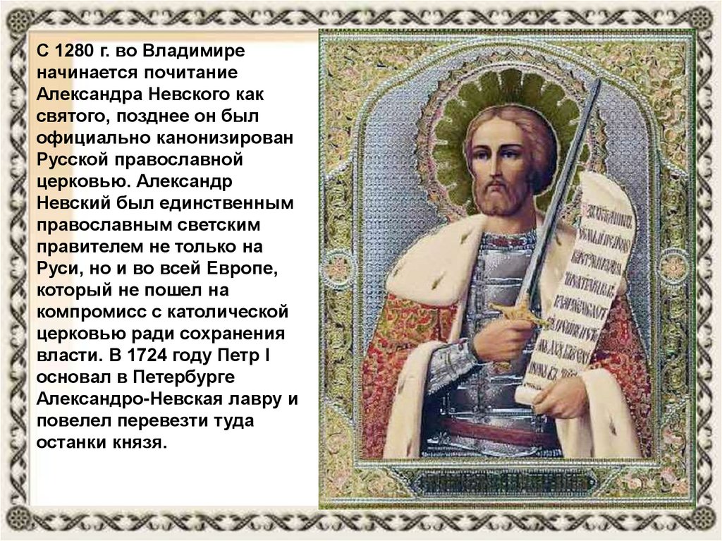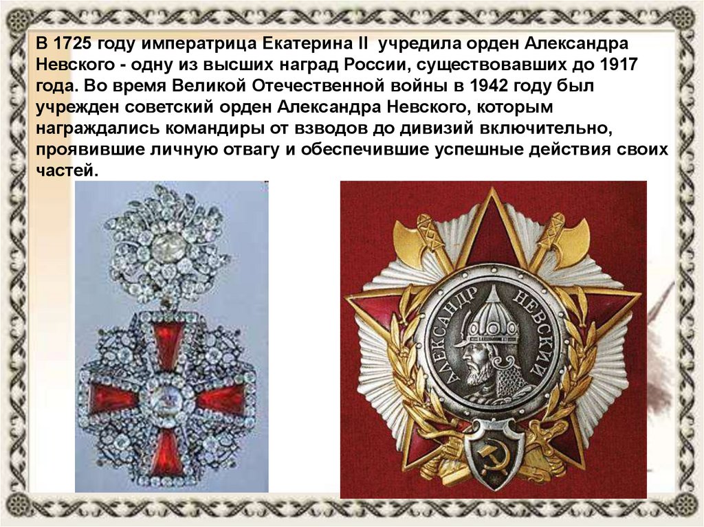В 1725 году императрица Екатерина II учредила орден АлександраНевского - одну из высших наград России, существовавших до 1917