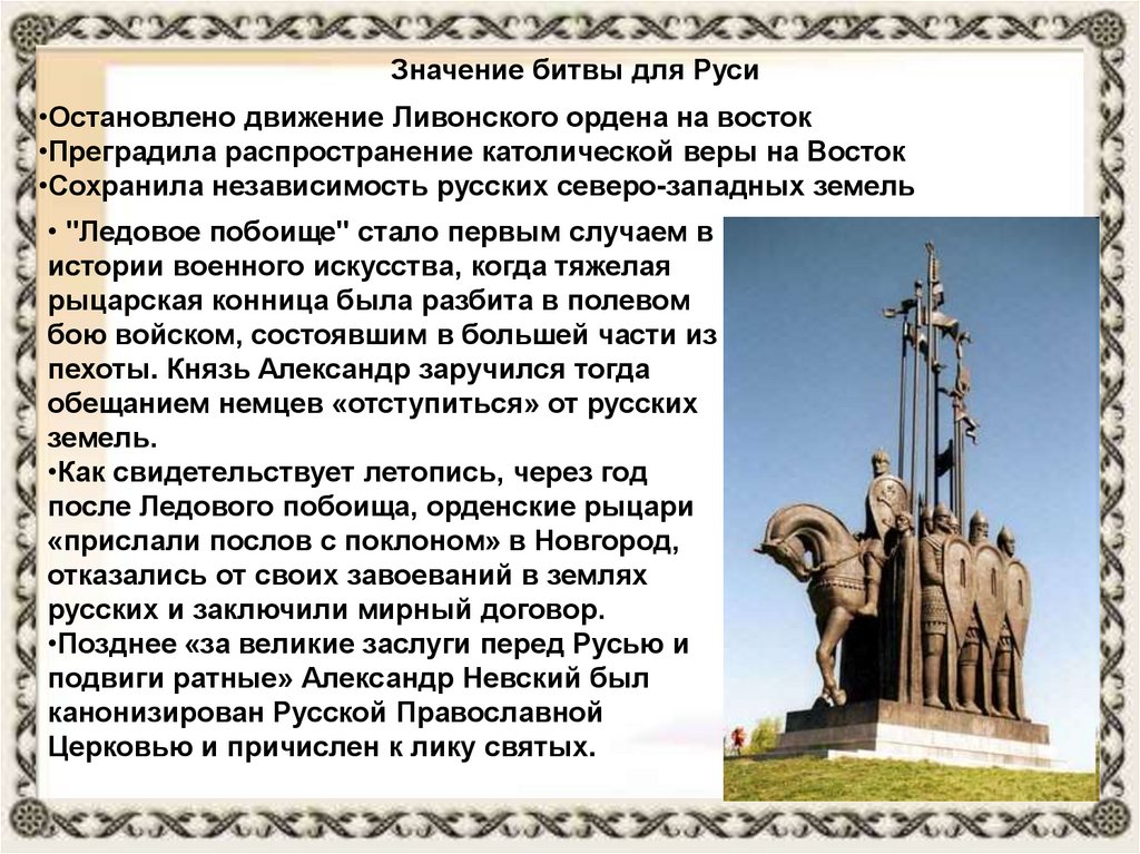 Значение битвы для Руси•Остановлено движение Ливонского ордена на восток