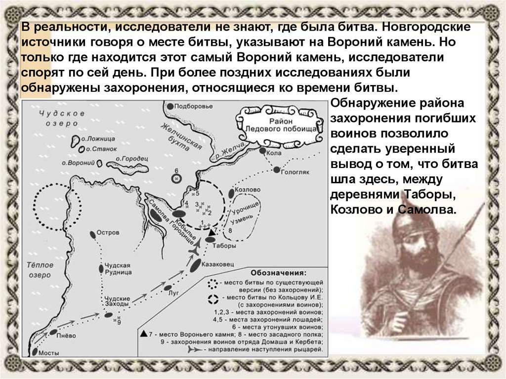 В реальности, исследователи не знают, где была битва. Новгородскиеисточники говоря о месте битвы, указывают на Вороний камень. Но