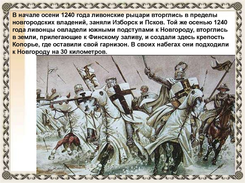 В начале осени 1240 года ливонские рыцари вторглись в пределыновгородских владений, заняли Изборск и Псков. Той же осенью 1240