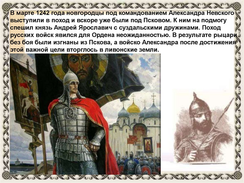 В марте 1242 года новгородцы под командованием Александра Невскоговыступили в поход и вскоре уже были под Псковом. К ним на подмогу