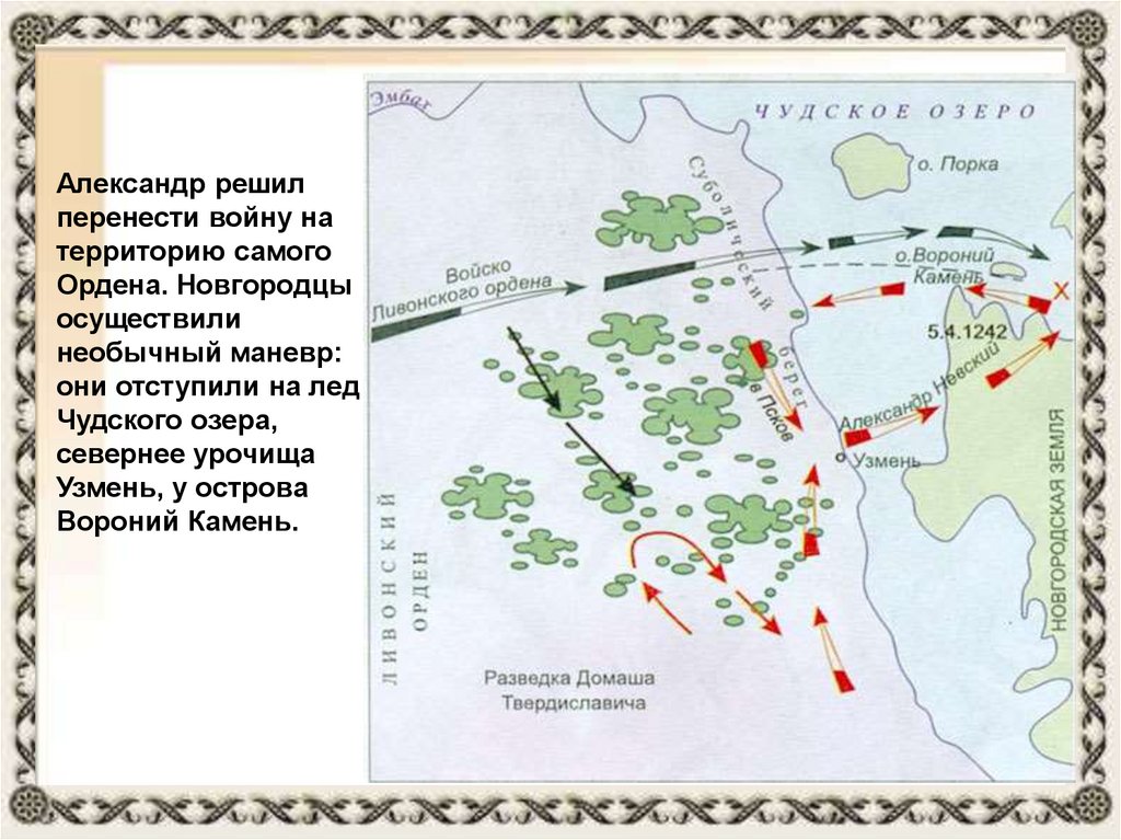 Выйдя на Чудское озеро, новгородское войско оказалось в центревозможных путей движения противника на Новгород. Туда в боевом