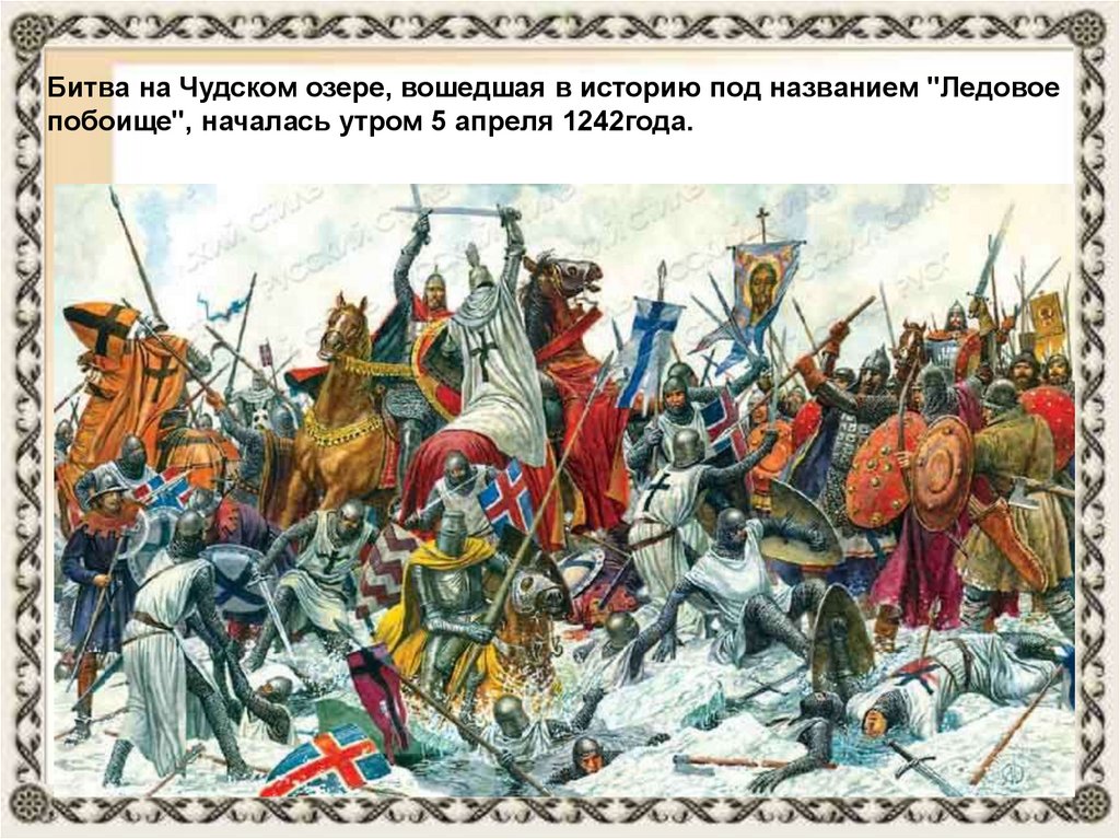 Битва на Чудском озере, вошедшая в историю под названием "Ледовоепобоище", началась утром 5 апреля 1242года.