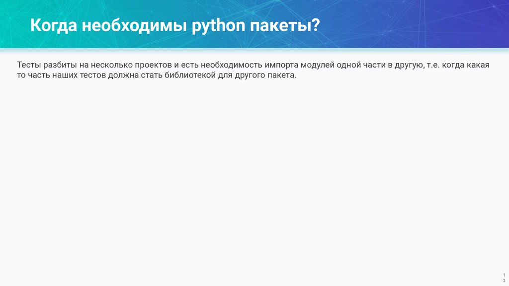 Когда необходимы python пакеты?Тесты разбиты на несколько проектов и есть необходимость импорта модулей одной части в другую, т.е. когда какая