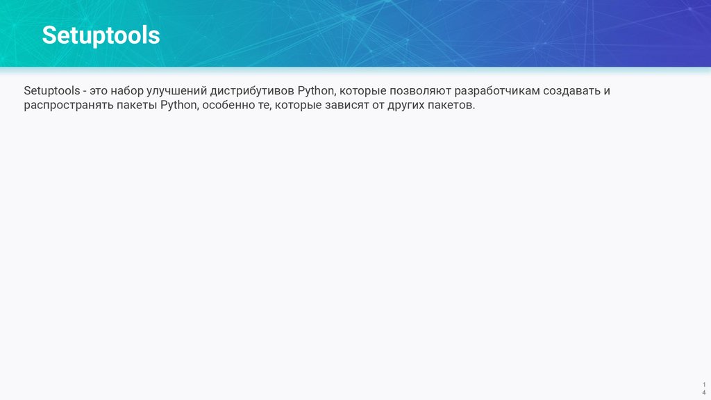 SetuptoolsSetuptools - это набор улучшений дистрибутивов Python, которые позволяют разработчикам создавать и
