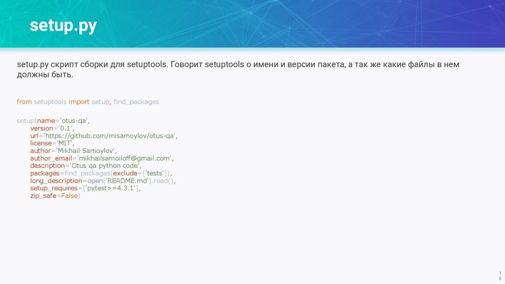 setup.pysetup.py скрипт сборки для setuptools. Говорит setuptools о имени и версии пакета, а так же какие файлы в нем