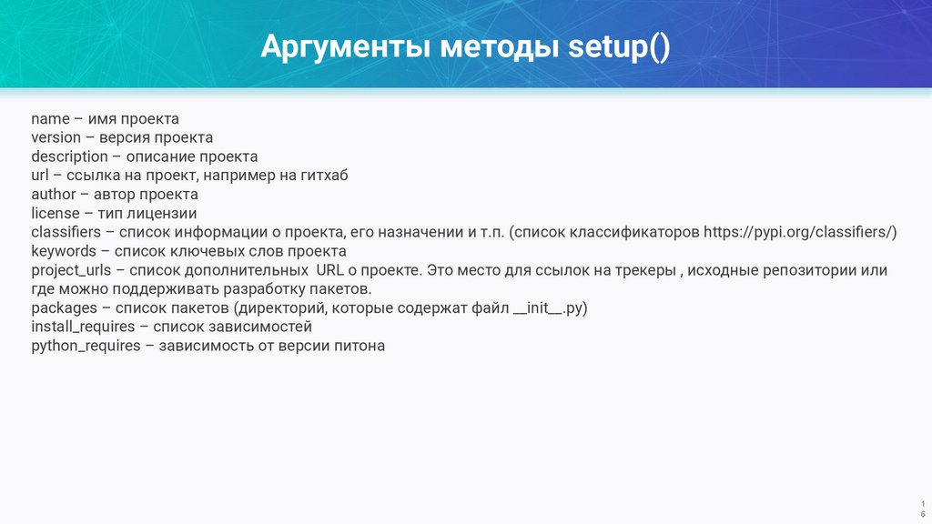 classi ers – список информации о проекта, его назначении и т.п. (список классификаторов https://pypi.org/classi ers/)