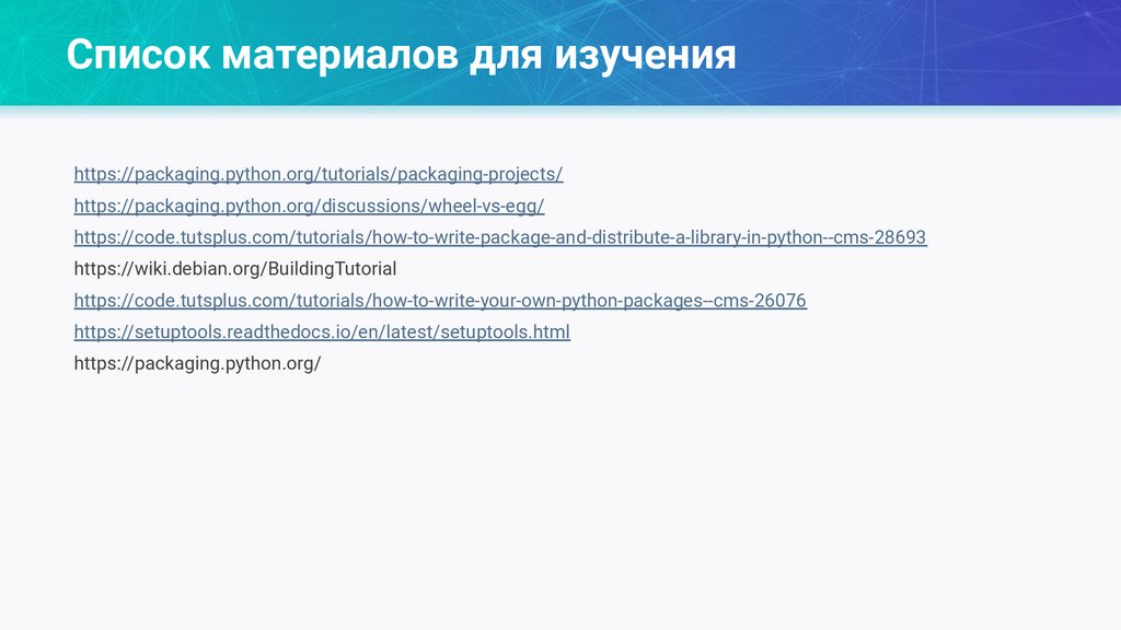 Список материалов для изученияhttps://packaging.python.org/tutorials/packaging-projects/