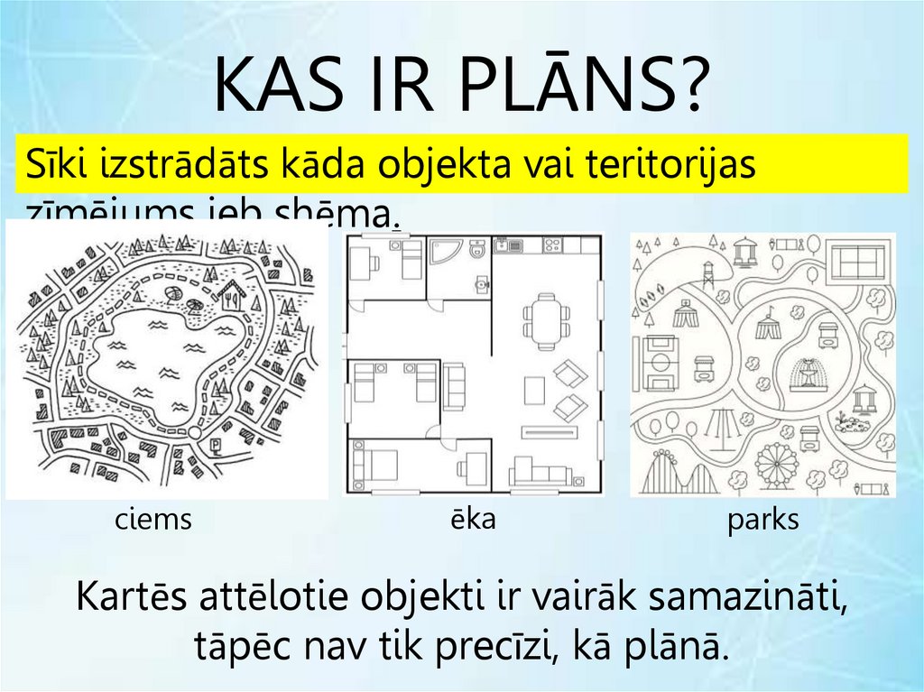 KAS IR PLĀNS?Sīki izstrādāts kāda objekta vai teritorijas
