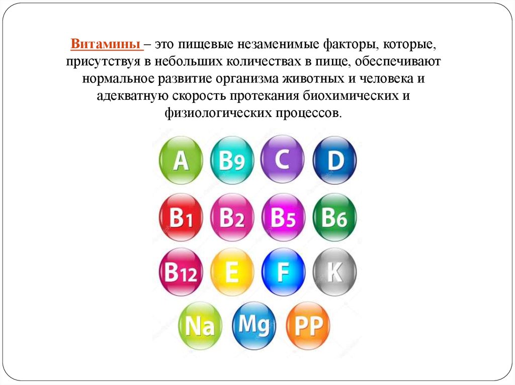 Витамины – это пищевые незаменимые факторы, которые,присутствуя в небольших количествах в пище, обеспечивают