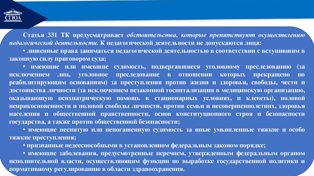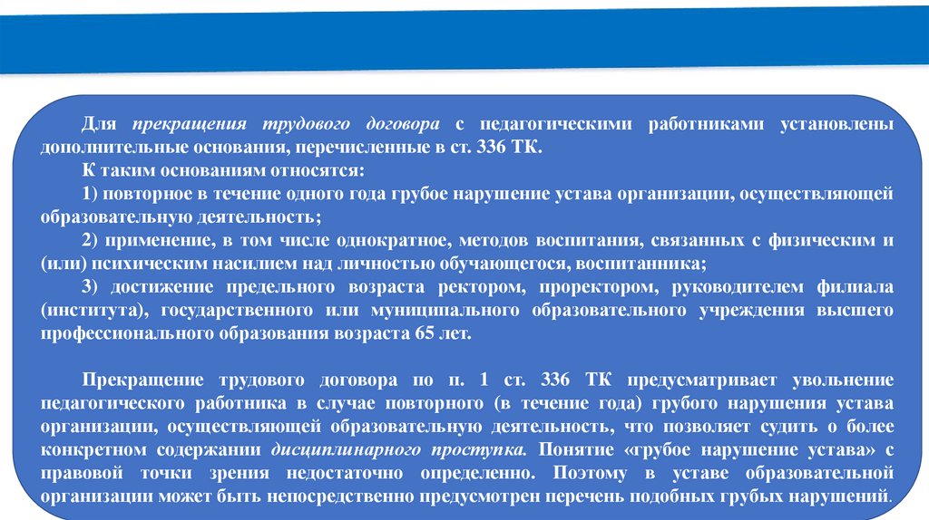 Для прекращения трудового договора с педагогическими работниками установленыдополнительные основания, перечисленные в ст. 336 ТК.