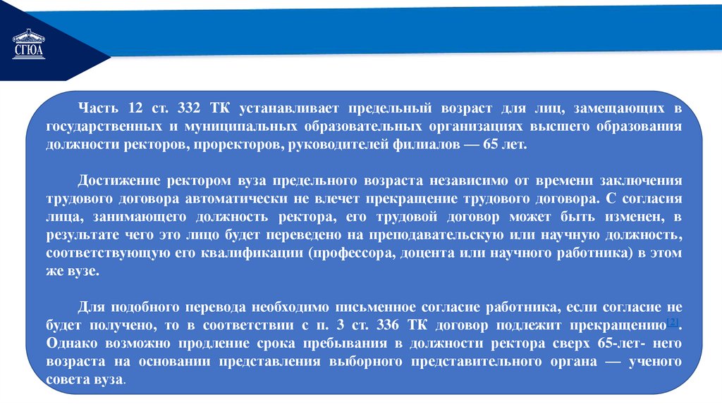 Часть 12 ст. 332 ТК устанавливает предельный возраст для лиц, замещающих вгосударственных и муниципальных образовательных организациях высшего образования