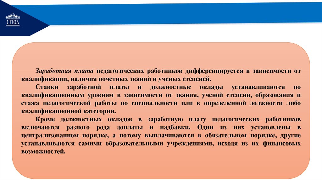 Заработная плата педагогических работников дифференцируется в зависимости отквалификации, наличия почетных званий и ученых степеней.