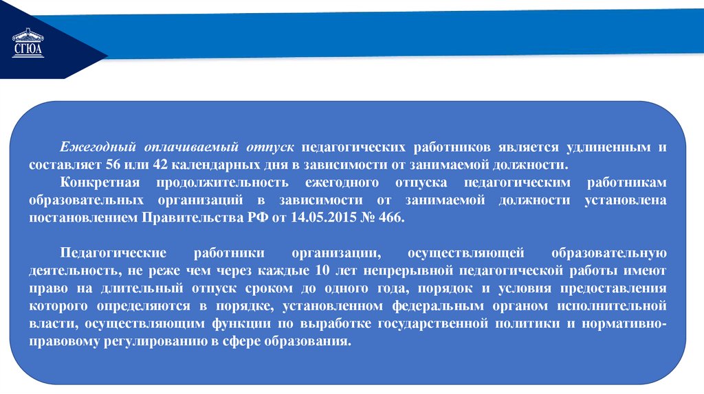 Ежегодный оплачиваемый отпуск педагогических работников является удлиненным исоставляет 56 или 42 календарных дня в зависимости от занимаемой должности.