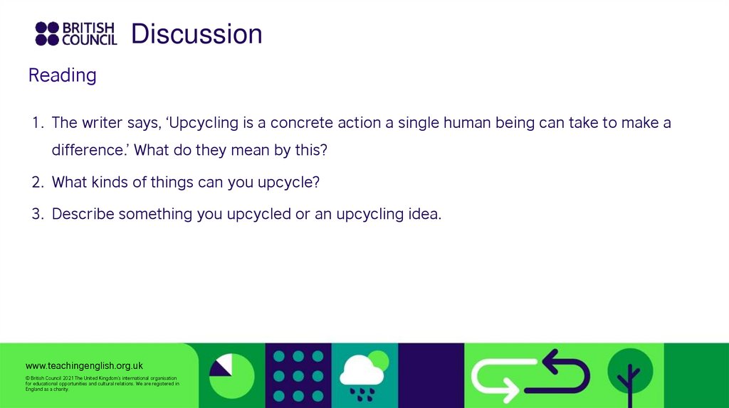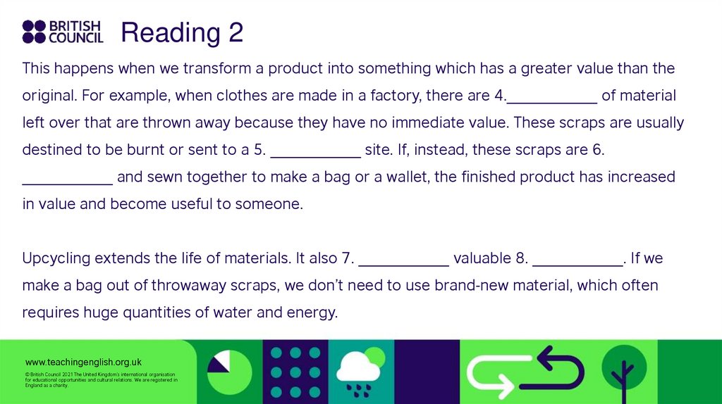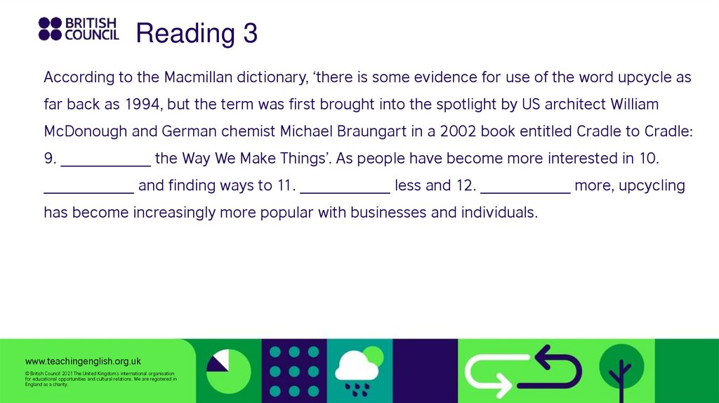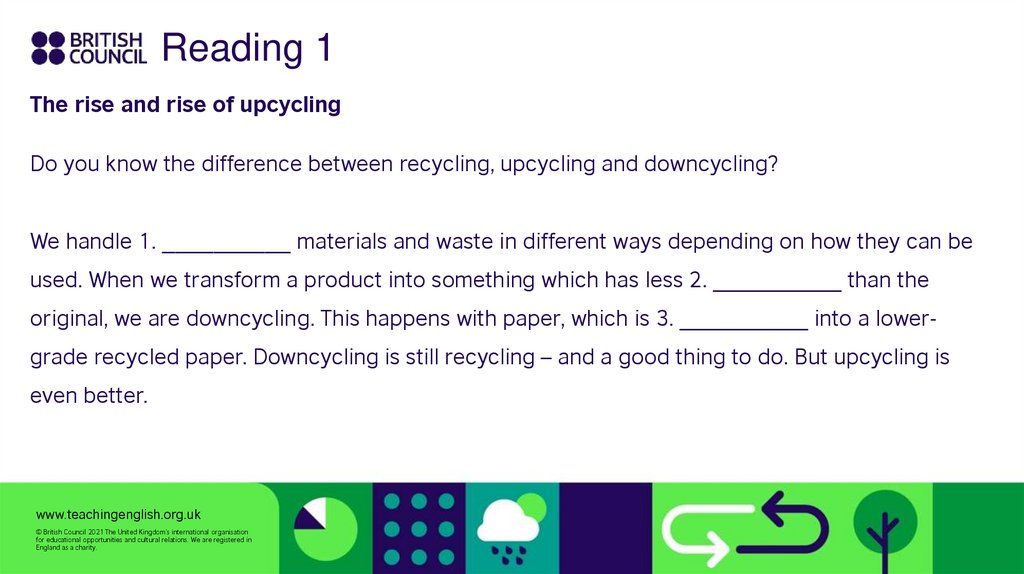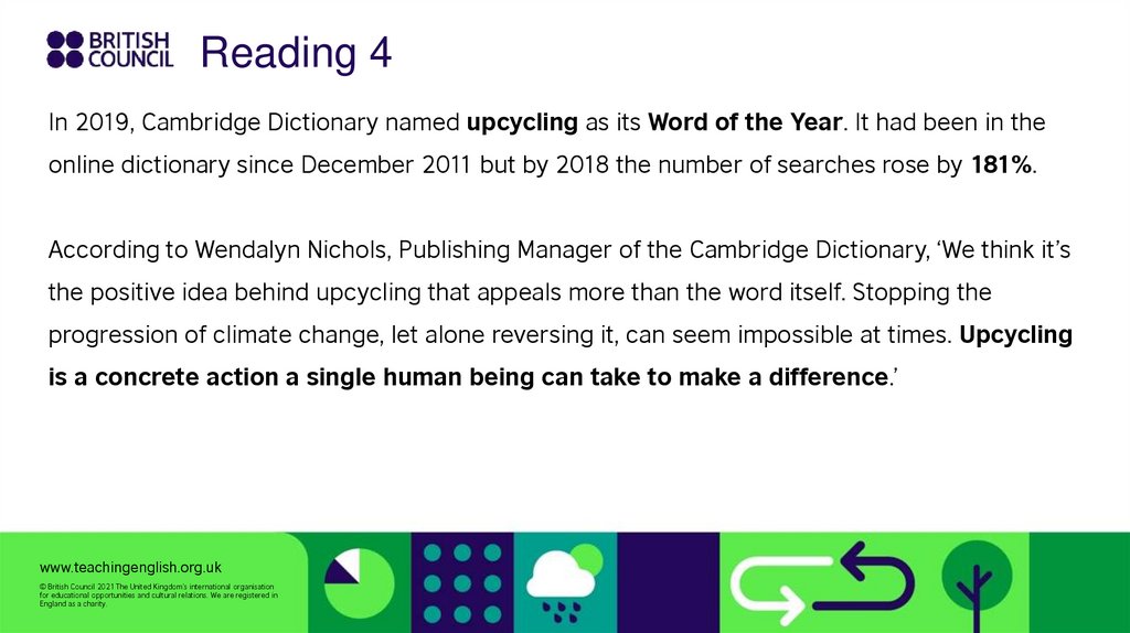 Reading 4In 2019, Cambridge Dictionary named upcycling as its Word of the Year. It had been in the
