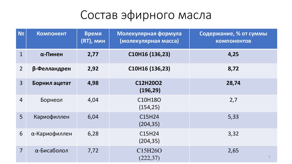 доминируют монотерпены, основным компонентом является борнил ацетат.