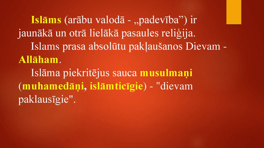 Islāms (arābu valodā - „padevība”) irjaunākā un otrā lielākā pasaules reliģija.