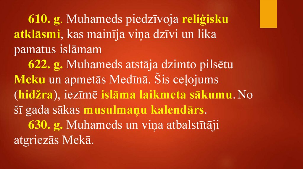 610. g. Muhameds piedzīvoja reliģiskuatklāsmi, kas mainīja viņa dzīvi un lika