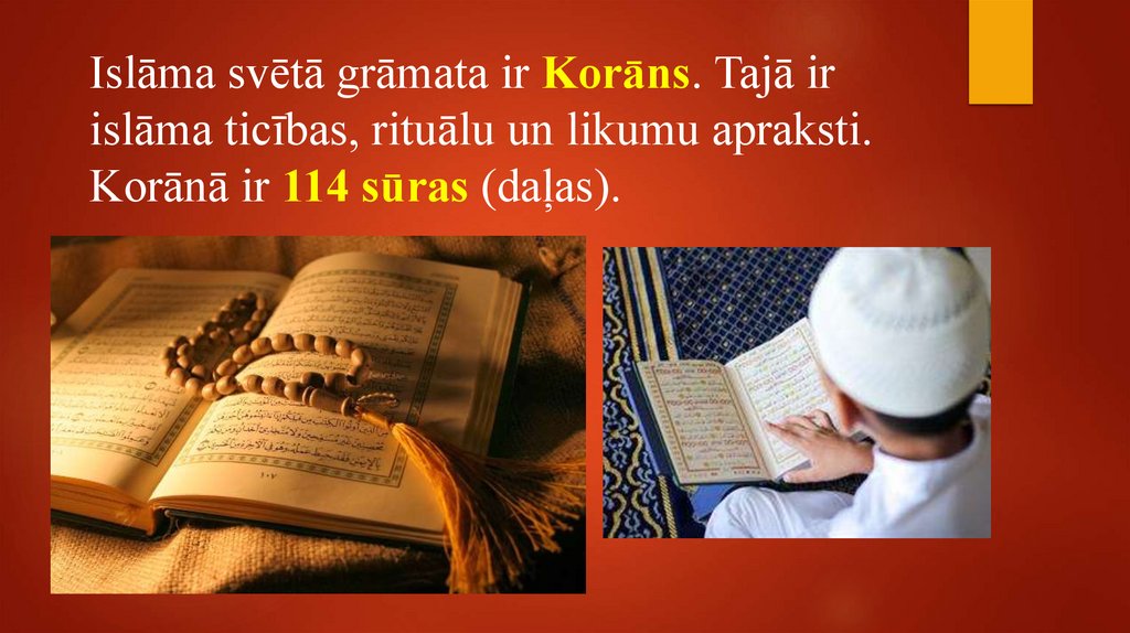 Islāma svētā grāmata ir Korāns. Tajā irislāma ticības, rituālu un likumu apraksti.