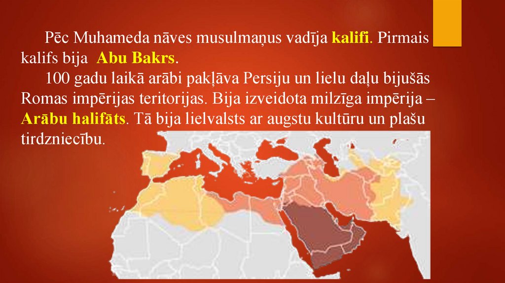 Pēc Muhameda nāves musulmaņus vadīja kalifi. Pirmaiskalifs bija Abu Bakrs.