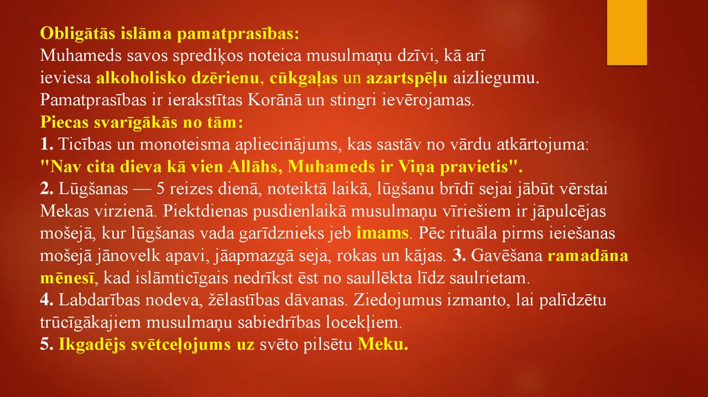 Obligātās islāma pamatprasības:Muhameds savos sprediķos noteica musulmaņu dzīvi, kā arī