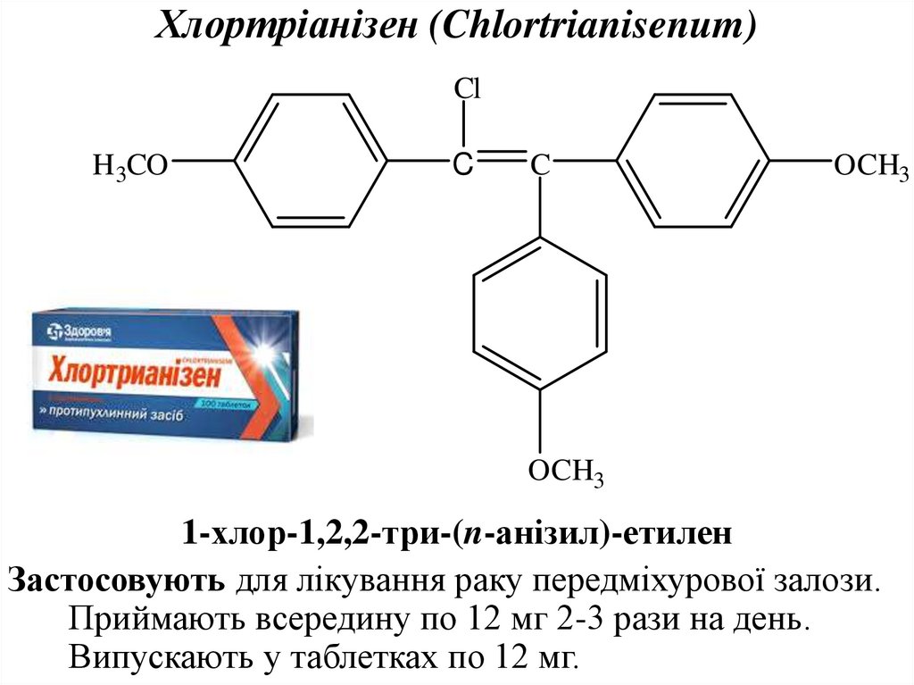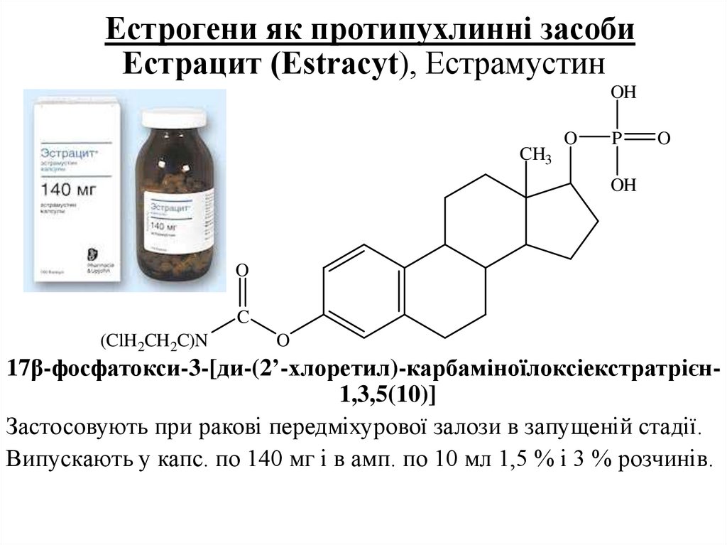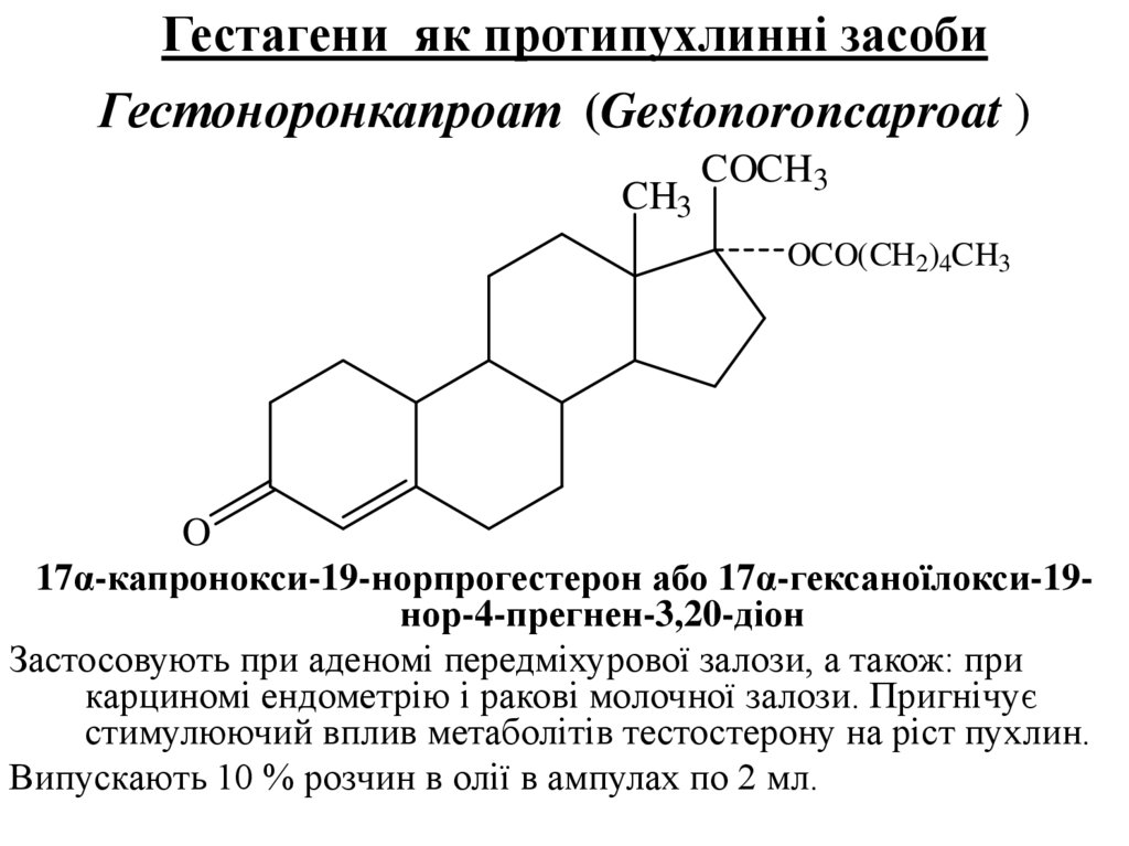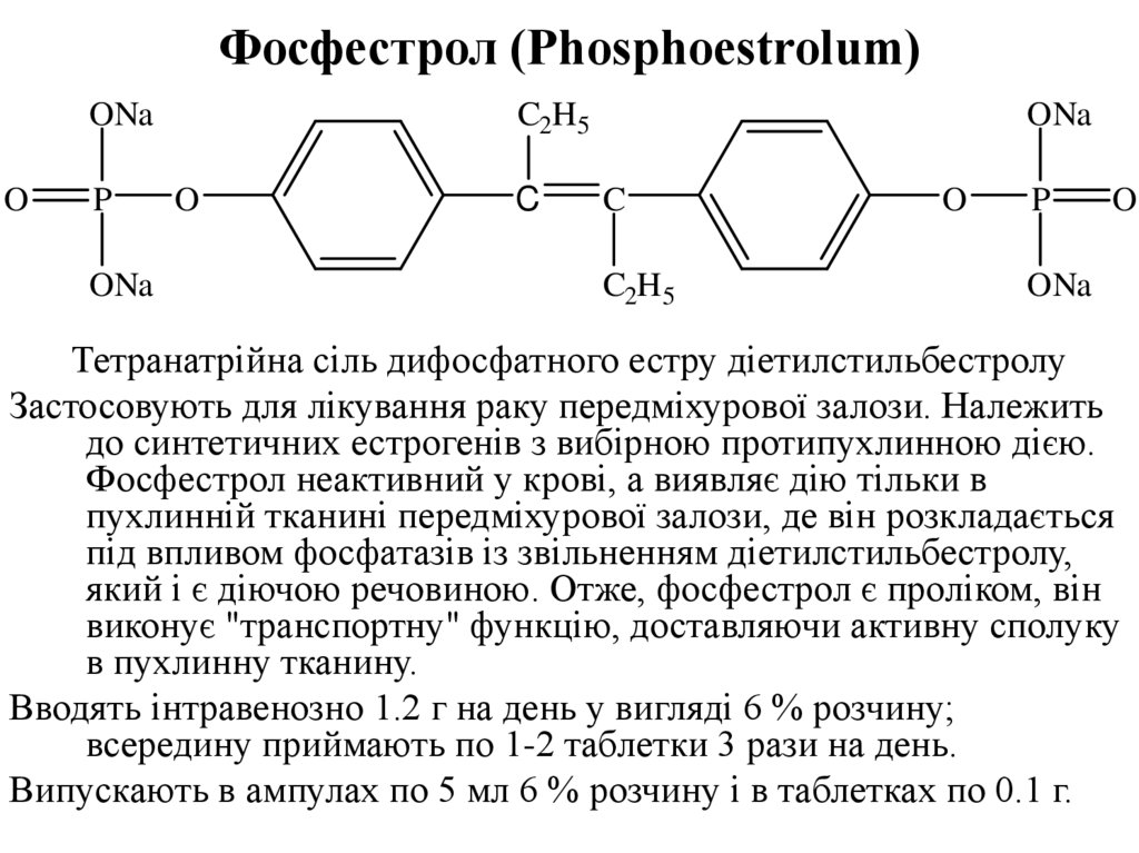 4. Гормональні засоби та їх антагоністи – медростеронупропіонат, фосфестрол, хлортріанізем, полиетрадіолфосфат, гестонорону капроат, медроксипрогестерону