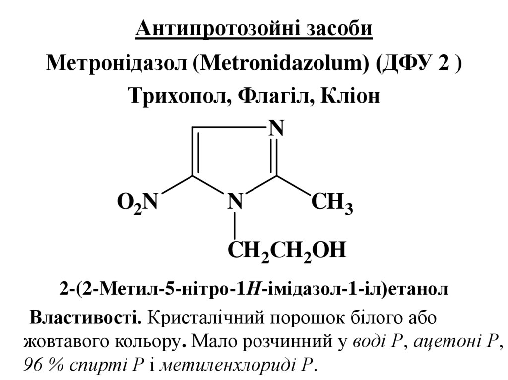 • Володіє широким спектром дії відносно простих,лямблій, анаеробних бактерій, пригнічує розвиток