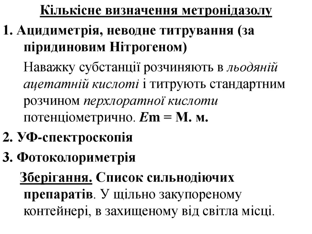 Кількісне визначення метронідазолу1. Ацидиметрія, неводне титрування (за