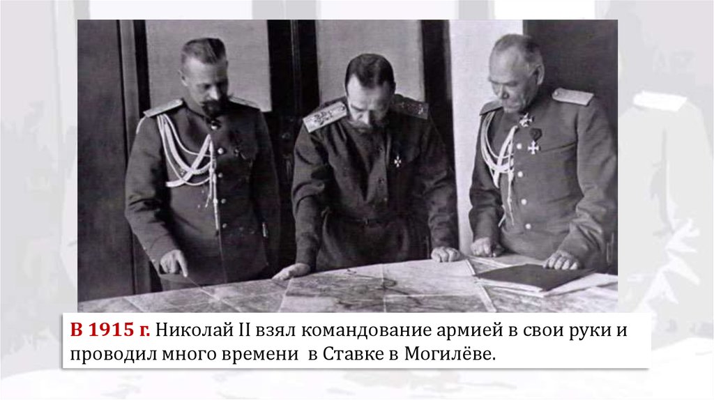 В 1915 г. Николай II взял командование армией в свои руки ипроводил много времени в Ставке в Могилёве.