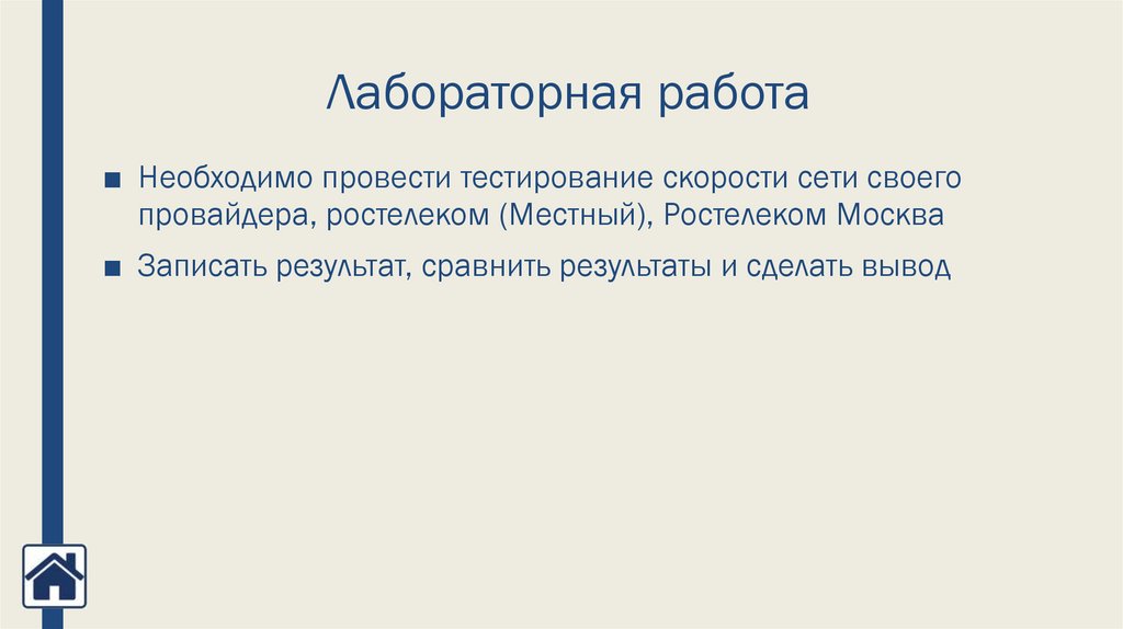 6. Необходимо провести тестирование скорости сети домашнего провайдера, ростелеком