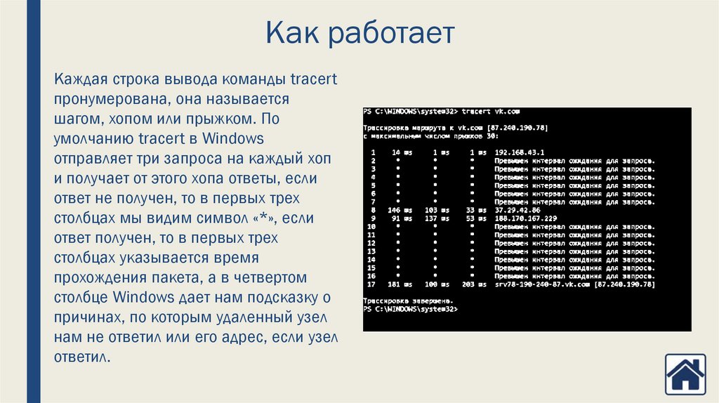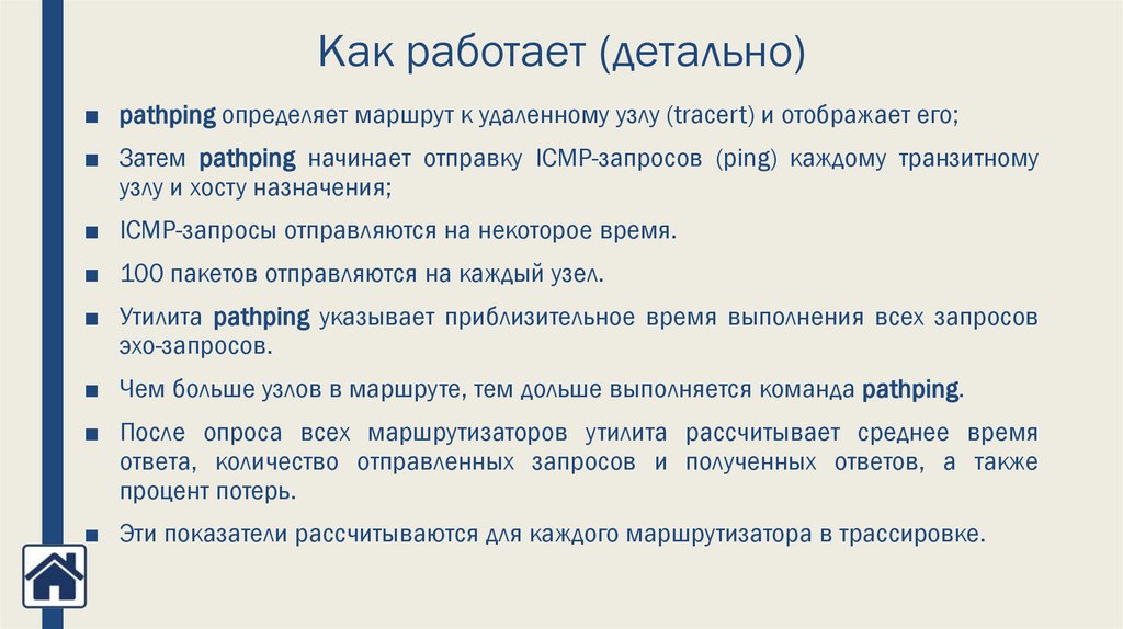 Как работает (детально)■ pathping определяет маршрут к удаленному узлу (tracert) и отображает его;