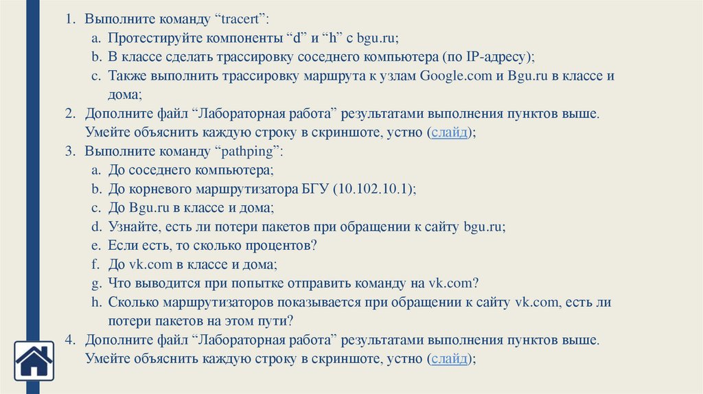 1. Выполните команду “tracert”:a. Протестируйте компоненты “d” и “h” с bgu.ru;