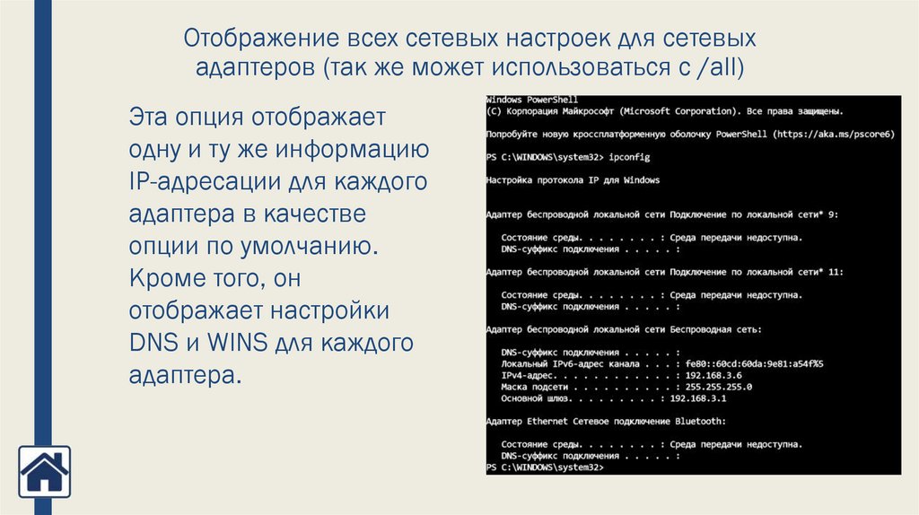 Отображение всех сетевых настроек для сетевыхадаптеров (так же может использоваться с /all)