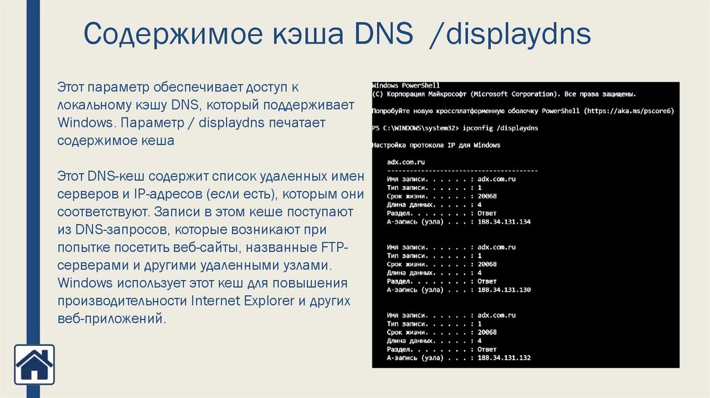 Содержимое кэша DNS /displaydnsЭтот параметр обеспечивает доступ к