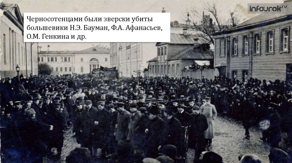 Черносотенцами были зверски убитыбольшевики Н.Э. Бауман, Ф.А. Афанасьев,