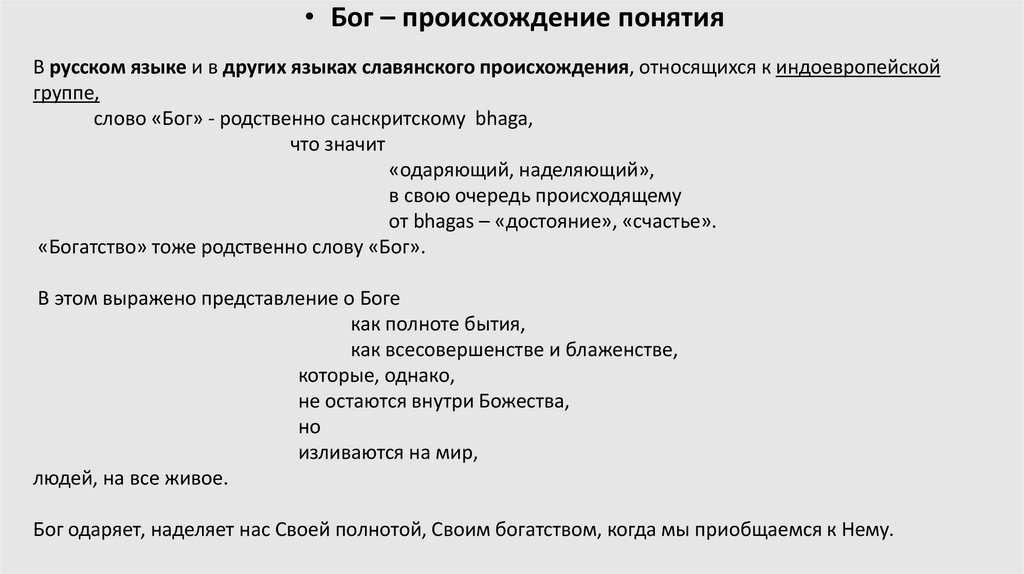 • Бог – происхождение понятияВ русском языке и в других языках славянского происхождения, относящихся к индоевропейской