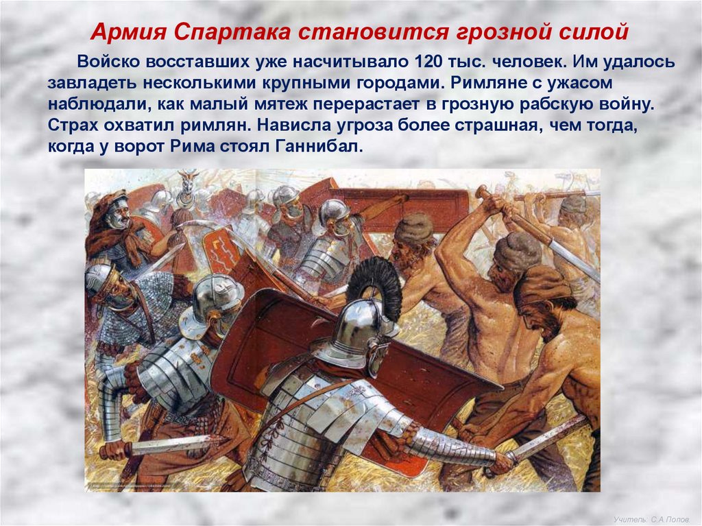 Армия Спартака становится грозной силойВойско восставших уже насчитывало 120 тыс. человек. Им удалось
