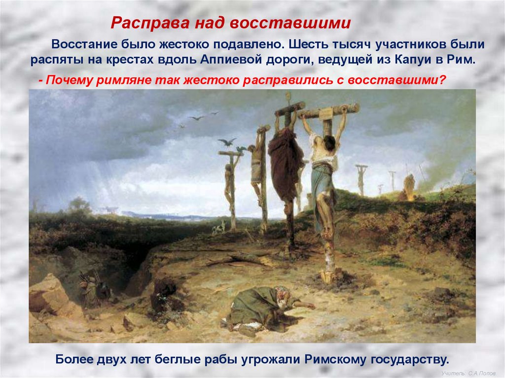 распяты на крестах вдоль Аппиевой дороги, ведущей из Капуи в Рим.