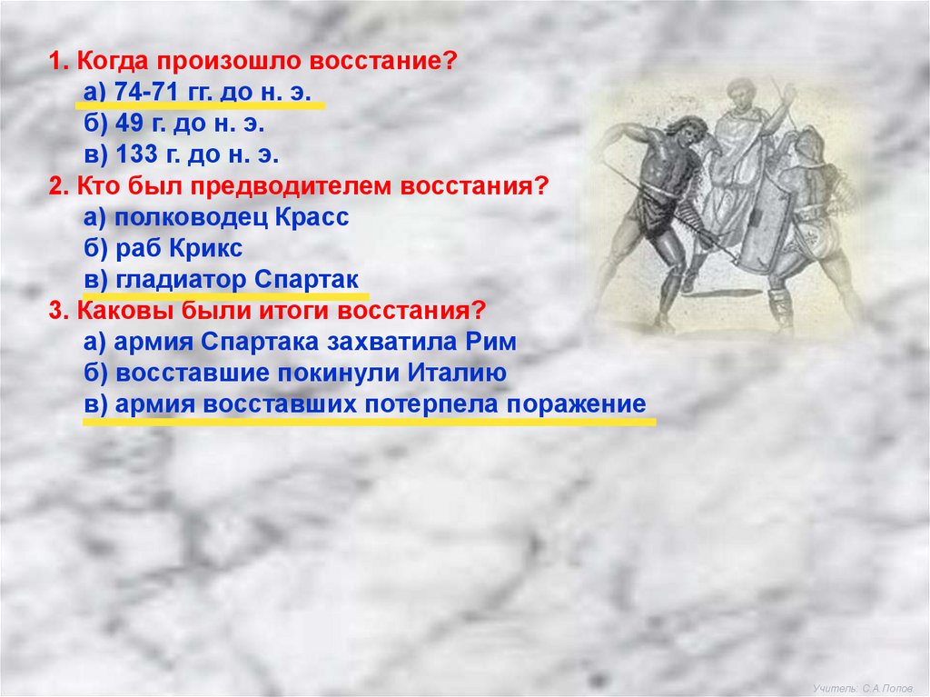 1. Когда произошло восстание?а) 74-71 гг. до н. э.