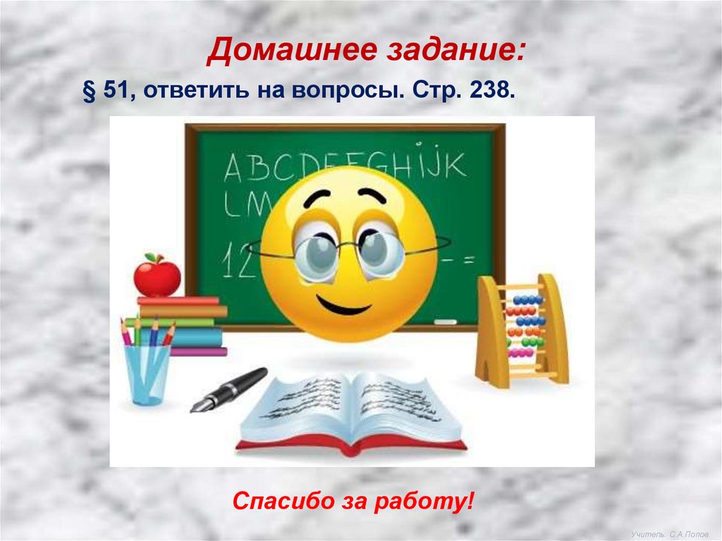 Домашнее задание:§ 51, ответить на вопросы. Стр. 238.