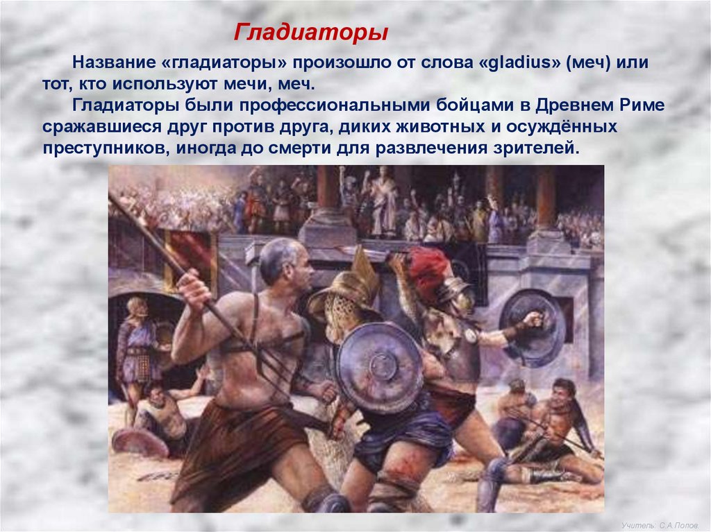 ГладиаторыНазвание «гладиаторы» произошло от слова «gladius» (меч) или
