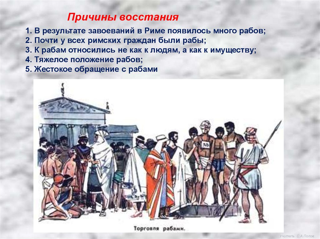 Причины восстания1. В результате завоеваний в Риме появилось много рабов;