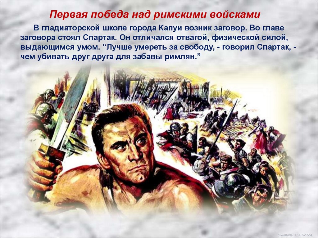 Первая победа над римскими войскамиВ гладиаторской школе города Капуи возник заговор. Во главе