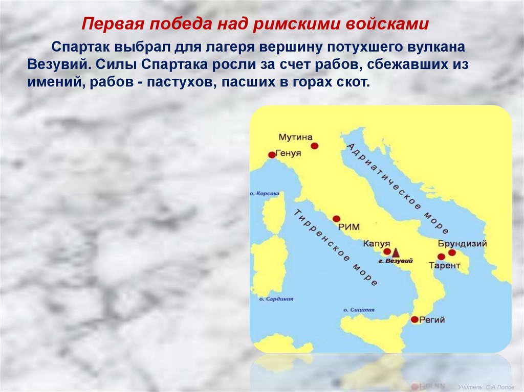 Первая победа над римскими войскамиВойско Спартака расположилось на Везувии. К Везувию послан
