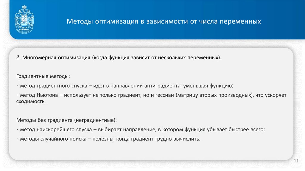 Методы оптимизация в зависимости от числа переменных2. Многомерная оптимизация (когда функция зависит от нескольких переменных).