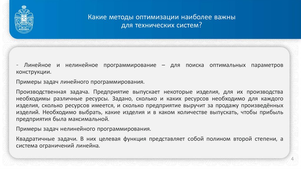 - Оптимизация конструкций (например, минимизация массы ствола артиллерийского орудия при