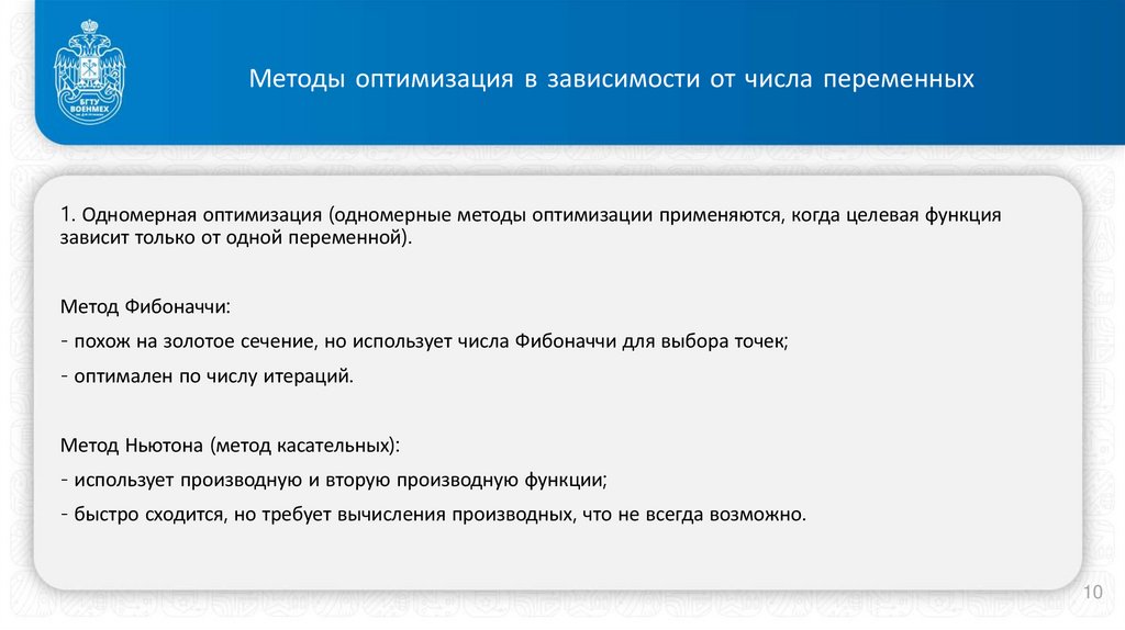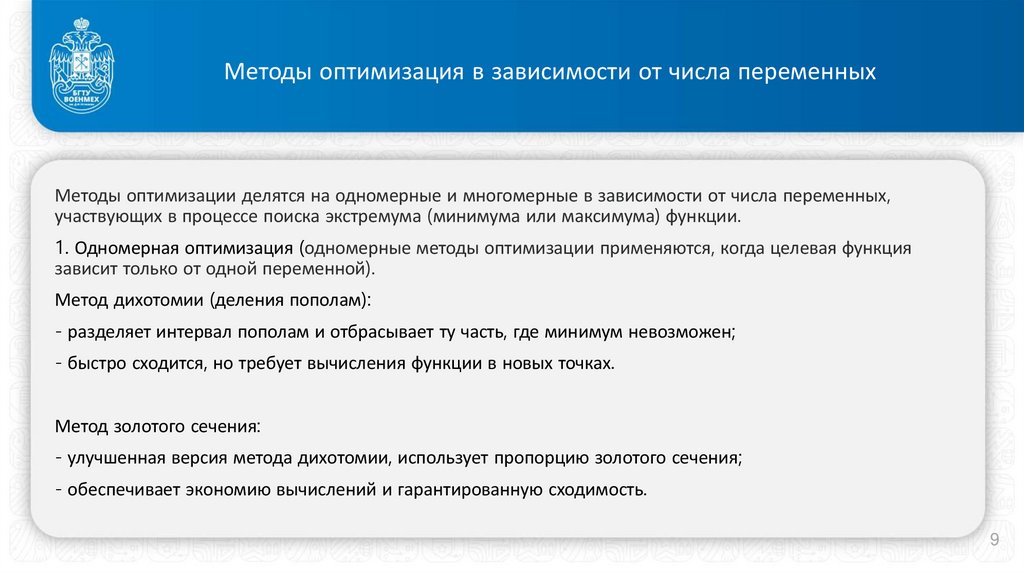 Методы оптимизация в зависимости от числа переменныхМетоды оптимизации делятся на одномерные и многомерные в зависимости от числа переменных,